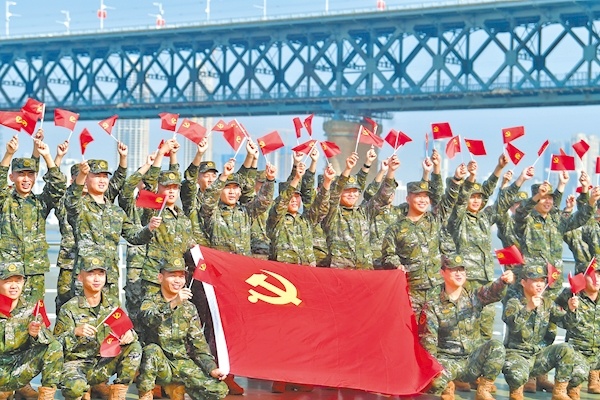 10月16日,武警湖北总队武汉支队船艇大队官兵开展“我与党旗来合影”活动,庆祝党的二十大胜利召开。(视界网 谢定安 唐伟 摄)